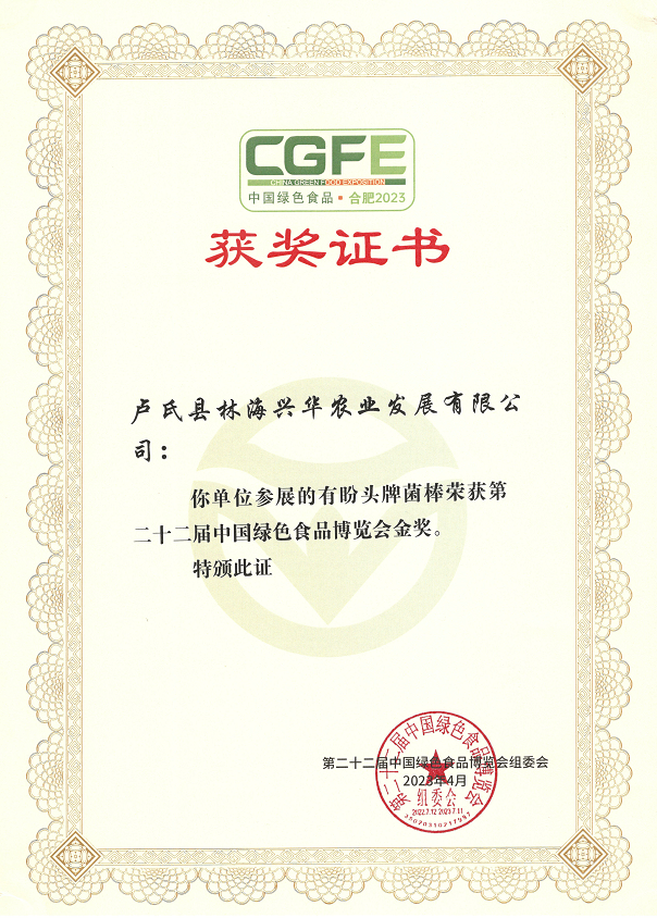 林海興華公司香菇再次榮獲中國綠色食品金獎