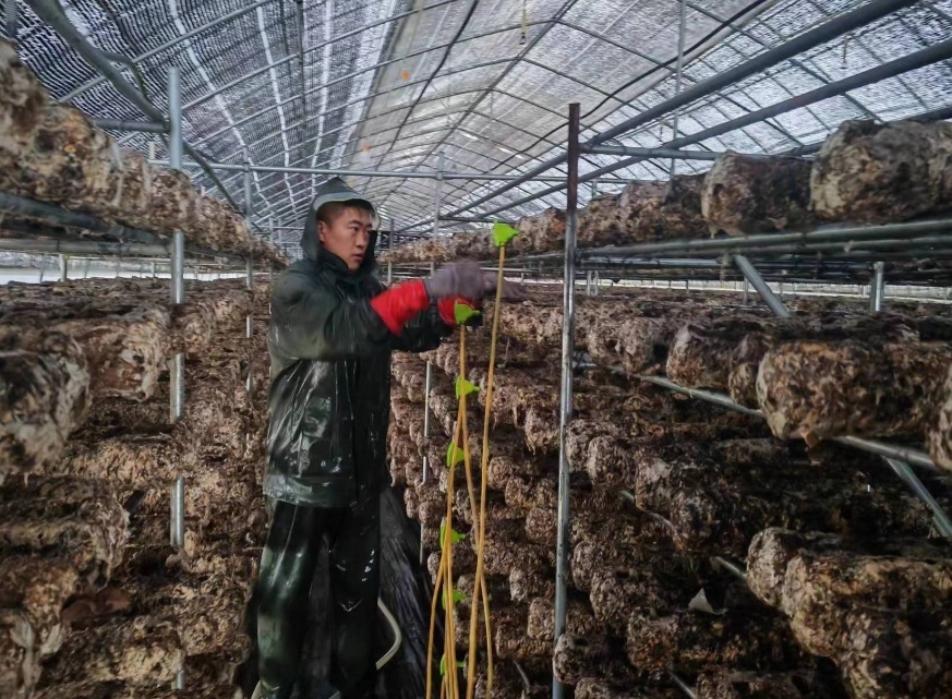 民灣村生產(chǎn)基地副主任王飛飛察看香菇長勢,樂不可支
