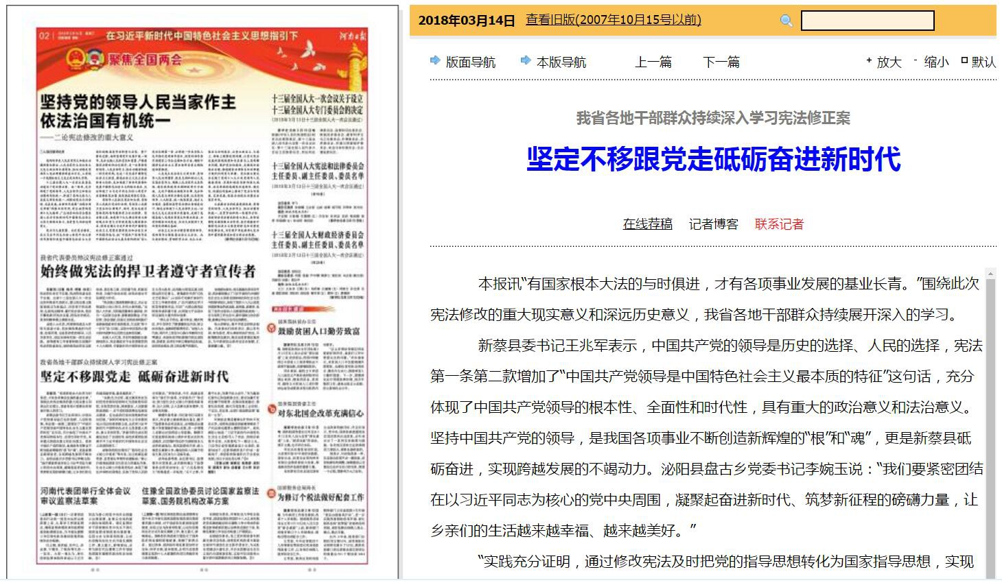 今天《河南日報》二版,《我省干部群眾熱議全國人大會漢通過憲法修正案》新聞中,共選用了新蔡縣委書記王兆軍、濟源供電公司總經理李國立、臨穎縣委宣傳部長李艷華、鶴壁市紀委書記馬鎖文、扶溝縣紀委書記常青、河南信念集團董事長葉傳林7位代表性人物的聲音。