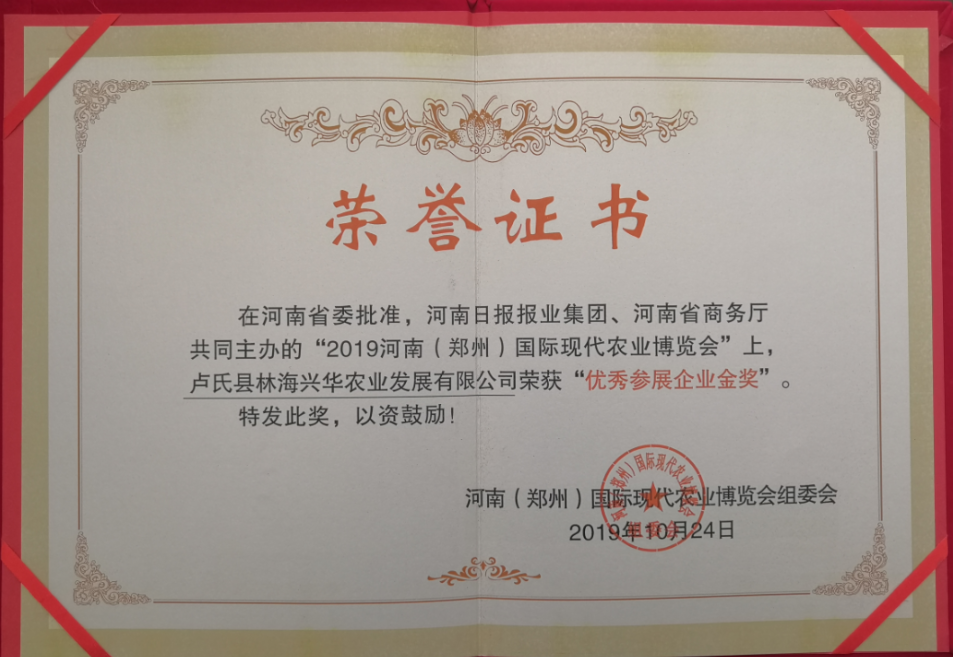 10月24日上午9:00,2019河南鄭州農(nóng)博會(huì)在鄭州國際會(huì)展中心隆重開幕。河南省商務(wù)廳黨組書記、廳長張延明,河南省農(nóng)業(yè)農(nóng)村廳黨組書記宋虎振等領(lǐng)導(dǎo)出席了開幕式。盧氏縣林海興華農(nóng)業(yè)發(fā)展有限公司受邀參加鄭州農(nóng)博會(huì),并榮獲“優(yōu)秀參展企業(yè)金獎(jiǎng)”。