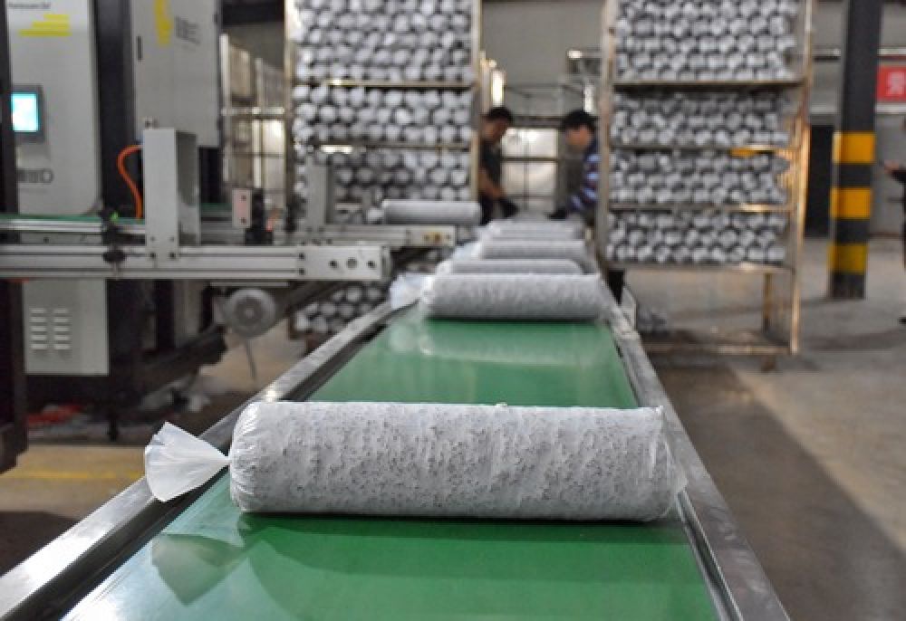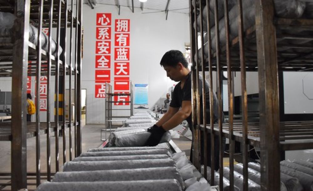 4月2日,在盧氏縣東明鎮(zhèn)澗北村菌棒廠,工人在香菇袋料生產(chǎn)線上作業(yè)。