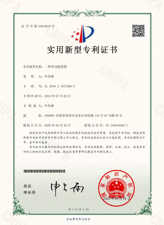 1、一種筆芯注墨裝置,證書號第10416958號,專利號:ZL 2019 2 1066087.7,授權公告日:2020年4月28日,授權公告號:CN 210415995U;