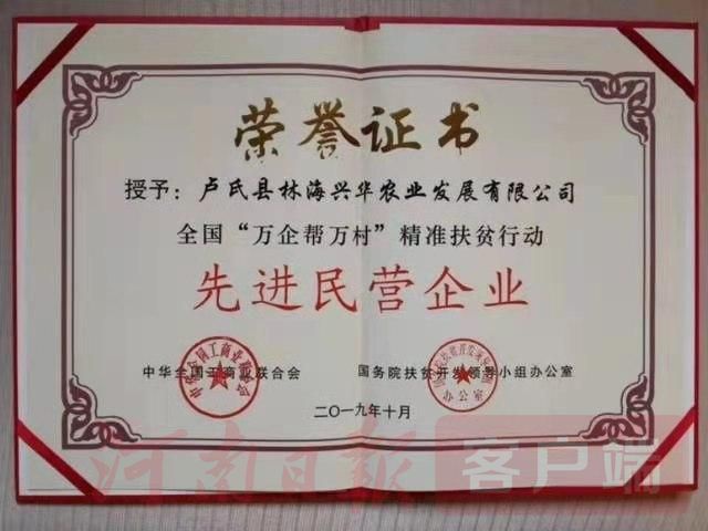 盧氏縣林海興華農(nóng)業(yè)發(fā)展有限公司獲評(píng)全國(guó)“萬企幫萬村”精準(zhǔn)扶貧行動(dòng)先進(jìn)民營(yíng)企業(yè)